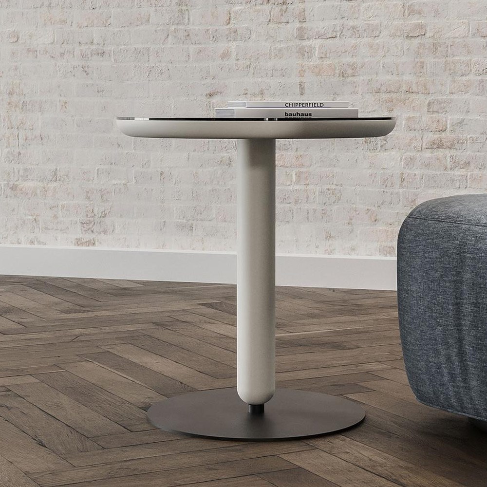 Чёрная стеклянная верхняя поверхность подчеркивает современный подход, а светло-серые ножки обеспечивают стабильность и элегантный вид.