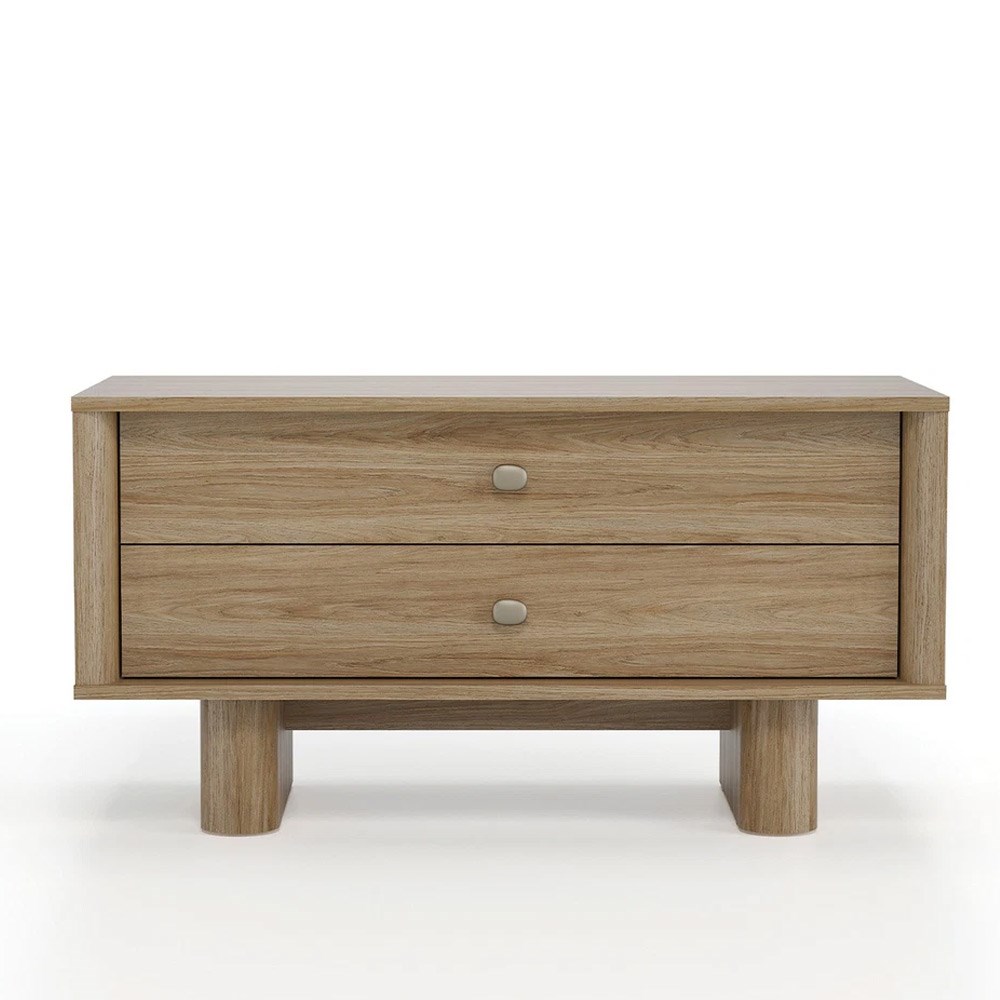 Тумба под ТВ PERGE сочетает теплоту натурального дубового оттенка с современной текстурой дерева. Металлические ручки цвета "металлик визон" добавляют дизайну элегантности, а прочные МДФ-углы и ножки создают стильный и надежный облик.