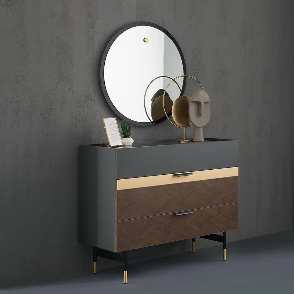 Зеркало DORIAN с темно-серой рамой создает элегантную атмосферу с помощью круглого натурального зеркала, которое завершает серию, олицетворяя эстетическое понимание декора нового поколения.