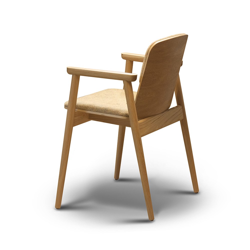 Модное сочетание открытого дерева и ткани позволит этому полукреслу вписаться и украсить любой проект.
