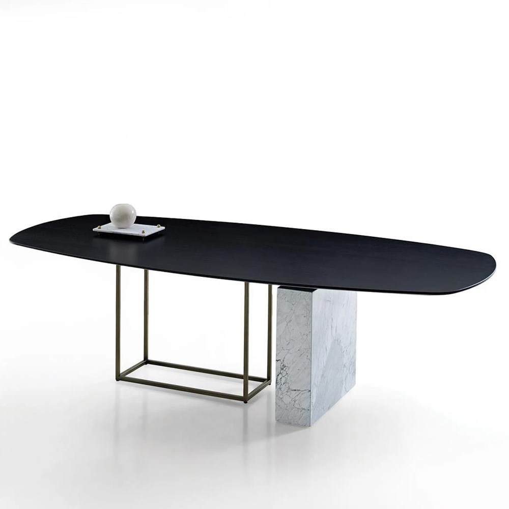 СТАЦИОНАРНЫЙ СТОЛ KARTUM придает стильную интерпретацию декору благодаря столешнице, покрытой шпоном черного дуба, и выделяет жилые помещения благодаря качественным деталям дизайна.