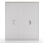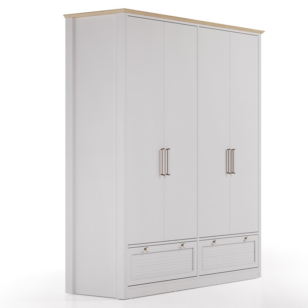 ШКАФ MARSELL С 4 ДВЕРЦАМИ, сочетающий теплое воздействие многослойных текстур с современным кантри-стилем, создает в спальнях светлую и умиротворяющую атмосферу благодаря комбинации белого цвета и столешницы из светлого дуба.