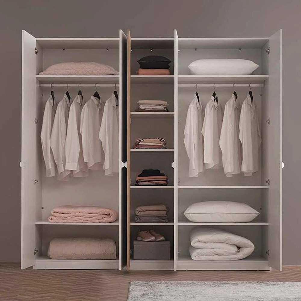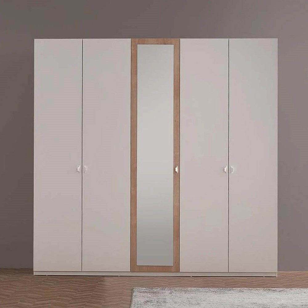 5-ДВЕРНЫЙ ШКАФ POLKA привносит в оформление вашей спальни простую элегантность, элегантность которой скрыта в функциональных деталях, белых металлических ручках и натуральном зеркале.
